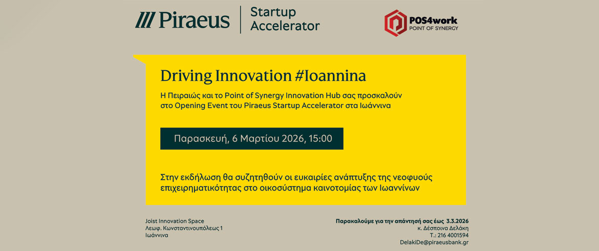 The event, organized by Piraeus Bank and the Point of Synergy Innovation Hub, will take place at Joist Innovation Space (1 Konstantinoupoleos Ave., Ioannina) and will focus on the growth opportunities for startups within Ioannina’s innovation ecosystem.