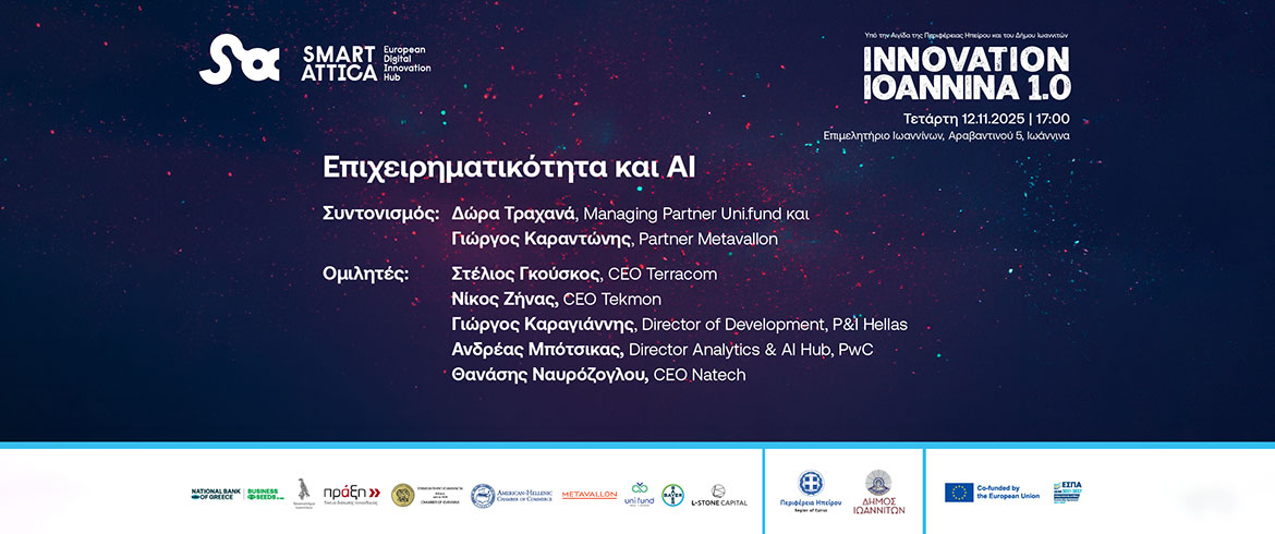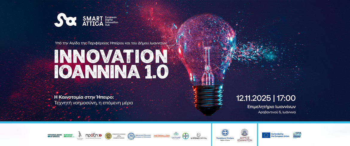 The event is held under the auspices of the Region of Epirus and the Municipality of Ioannina, as part of the Smart Attica EDIH activities. It is co-organized by the NBG Business Seeds program of the National Bank of Greece, the Ioannina Chamber of Commerce, the University of Ioannina, PRAXI Network / FORTH, Uni.fund, Metavallon, L-Stone Capital, the Hellenic-American Chamber of Commerce, and Bayer Hellas.
